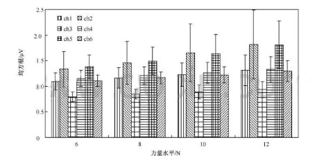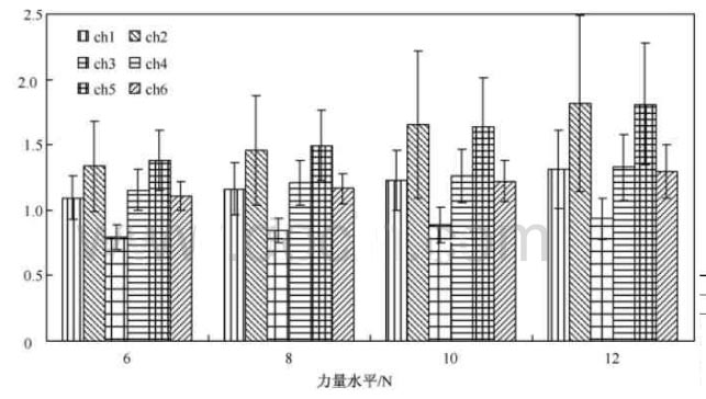 計(jì)算出每個(gè)受試者所有動(dòng)作的 RMS 然后對每一力量水平下重復(fù)5 次的特征值數(shù)據(jù)取平均。圖 顯示了各通道sEMG 信號(hào)RMS 值在不同力量水平下的幅值變化。