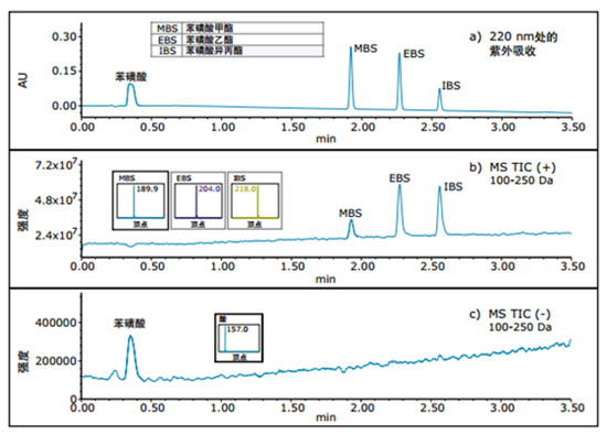 以“苯磺酸脂類基因毒性檢測”為例,苯磺酸甲酯、乙酯和異丙酯的化學(xué)結(jié)構(gòu)如下表所示。分離這些化合物得到的UV和MS色譜數(shù)據(jù)如圖1所示。下述UV譜圖表明苯磺酸在其甲酯、乙酯和異丙酯之前洗脫。在質(zhì)量范圍(100~250 Da)內(nèi)采集的ACQUITY QDa MS數(shù)據(jù)稱為總離子流色譜圖(TIC),表明在ESI+模式下可檢測出烷基酯,而在ESI-模式下可檢測出苯磺酸。質(zhì)譜數(shù)據(jù)表明酯類形成了銨加合物[M+NH4]+。