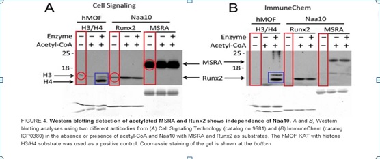 3)但從圖B (抗體來(lái)源ImmuneChem, ICP0380)的結(jié)果(藍(lán)方框)看,該抗體能特異性的識(shí)別了乙;H3, 可以得出結(jié)論只有hMOF酶和Acety-CoA同時(shí)存在催化下, H3發(fā)生了乙;。