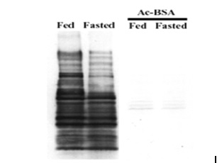 圖:用IMMUNECHEM的抗體檢測(cè)細(xì)胞飼-餓(左2道)處理的乙酰化蛋白信號(hào)可以被乙;疊SA抑制(右2道).