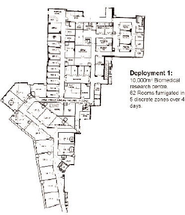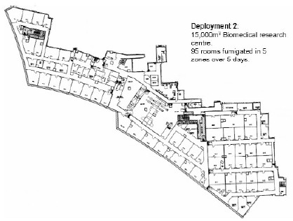 如此大型的項目需要大量的前期準備工作,在實施的每個階段Bioquell的RBDS項目經(jīng)理同客戶保持著緊密的聯(lián)絡。根據(jù)目標區(qū)的布局結構、客戶需求和其他后勤方面的考慮將其分為幾個獨立的區(qū)域分別熏蒸,每個獨立區(qū)域配合精確計算的循環(huán)參數(shù)進行獨立的消毒操作。
