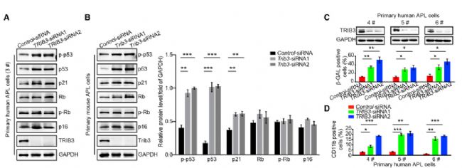 老生常談,我們先解讀一下題目:TRIB3 Promotes APL Progression through Stabilization of the Oncoprotein PML-RARα and Inhibition of p53-Mediated Senescence.