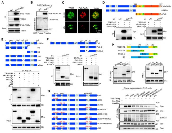 對(duì)于另一部分,在文章前期結(jié)果中作者已經(jīng)證明了TRIB3是通過(guò)抑制PML-RARα/PML的泛素化水平來(lái)調(diào)節(jié)其表達(dá)的,而后通過(guò)Co-IP驗(yàn)證了TRIB3與PML-RARa/PML有直接相互作用(Fig4),并尋找到TRIB3在PML上的作用位點(diǎn),進(jìn)而深入研究此位點(diǎn)與兩者相互作用之間的關(guān)系。