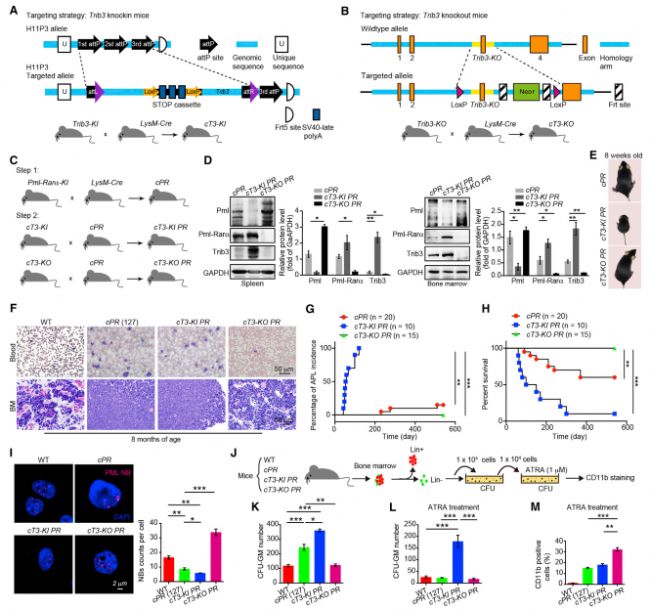 作者分別構(gòu)建了針對(duì)基因TRIB3的條件敲除和敲入鼠,檢測(cè)了APL分子標(biāo)記物PML-RARα在不同鼠中的表達(dá)情況,并取出其原發(fā)性造血祖細(xì)胞進(jìn)行克隆形成實(shí)驗(yàn)佐證結(jié)論(即基因TRIB3的表達(dá)促進(jìn)了APL的發(fā)生)(Fig2);與此同時(shí),對(duì)來(lái)自病人的APL細(xì)胞進(jìn)行了TRIB3干擾實(shí)驗(yàn),并監(jiān)測(cè)其表型,進(jìn)一步對(duì)結(jié)論進(jìn)行驗(yàn)證。