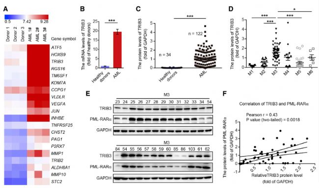 作者分選收集了3例正常人及3例急性髓細(xì)胞白血。ˋML)患者的CD34+細(xì)胞,以此為基礎(chǔ)使用芯片進(jìn)行差異編碼基因的篩選。通過(guò)對(duì)芯片結(jié)果的注釋分析,作者最終決定聚焦在表達(dá)上調(diào)幅度排名前20的基因TRIB3進(jìn)行后續(xù)研究。回到臨床樣本上,作者發(fā)現(xiàn)TRIB3在AML的一種亞型APL患者中表達(dá)水平相較其他亞型要高很多,并且與PML-RARα(APL的分子標(biāo)志物)的表達(dá)正相關(guān)(Fig 1)。