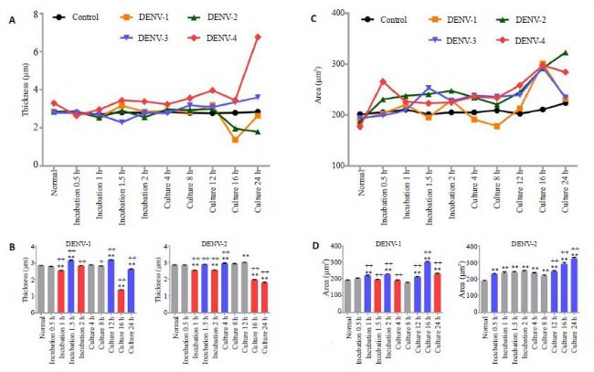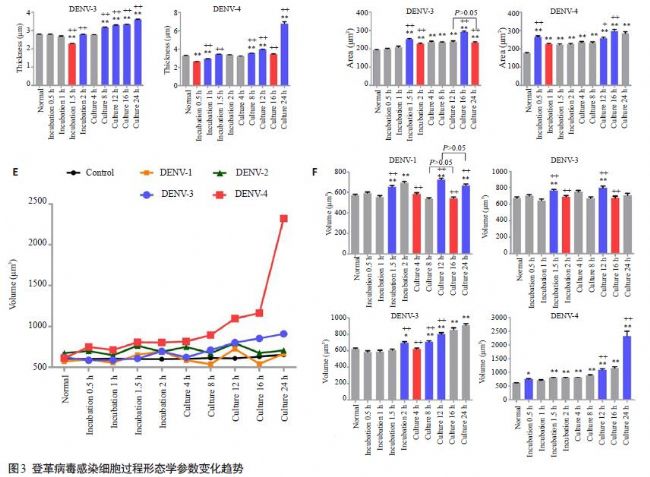 細胞面積和體積增大表現(xiàn)一致,但孵育期間DENV1-4均表現(xiàn)細胞厚度減小不同,培養(yǎng)期間DENV1、2細胞厚度減小而DENV3、4出現(xiàn)截然相反的厚度增大現(xiàn)象。同時,不同血清型間變化趨勢及程度具有各自特異性。