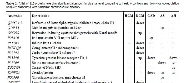 本文思路清晰簡明,使用正常人46例、肥厚型心肌病47例、擴張性心肌。―CM)21例、冠心。–AD)20例、主動脈狹窄(AS)24例和高血壓(AH)20例的血清樣本進行Itraq蛋白質(zhì)組學比對。通過2v4v2v2v2v2分組比較,共鑒定到476個蛋白質(zhì),共128個血漿蛋白與心臟病變有關,其中49個是沒有報道過的新蛋白質(zhì)。