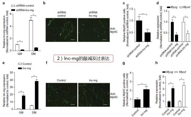 為探究lnc-mg在肌細(xì)胞生成過(guò)程中的角色,研究人員對(duì)lnc-mg進(jìn)行功能分析,首先進(jìn)行了lnc-mg的敲降和過(guò)表達(dá)。結(jié)果顯示,敲降后,MuSCs的分化受到抑制,其分子標(biāo)志MyHC表達(dá)降低,肌小管數(shù)量減少;過(guò)表達(dá)后,MuSCs分化加強(qiáng),肌小管數(shù)目增加。