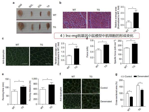 此外,研究人員構(gòu)建了lnc-mg敲除小鼠模型和轉(zhuǎn)基因TG模型(模型來(lái)自賽業(yè)生物),分別檢測(cè)腓腸肌(GAS),比目魚(yú)。⊿OL),伸縮。‥DL)和脛骨前肌的形狀變化,檢測(cè)發(fā)現(xiàn)lnc-mg敲除小鼠的肌肉重量變輕,體積變小,而TG小鼠的肌肉組織變重變大;此外,兩種肌肉的僵直機(jī)能和運(yùn)動(dòng)能力也完全相反。這些體外和體內(nèi)實(shí)驗(yàn)驗(yàn)證了lnc-mg是影響肌生成的重要lncRNA。