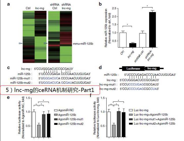 那么lnc-mg是通過(guò)什么調(diào)控機(jī)制影響肌細(xì)胞生成呢?研究人員首先對(duì)lnc-mg進(jìn)行細(xì)胞定位,F(xiàn)ISH實(shí)驗(yàn)結(jié)果發(fā)現(xiàn)lnc-mg在胞質(zhì)和核內(nèi)都有,但是在分化的成肌細(xì)胞中主要定位在細(xì)胞質(zhì)中。因此,研究人員想到了ceRNA調(diào)控機(jī)制,為驗(yàn)證這個(gè)假設(shè),研究人員通過(guò)芯片檢測(cè)了過(guò)表達(dá)和敲降細(xì)胞的miRNA表達(dá)變化,發(fā)現(xiàn)miR-125b在過(guò)表達(dá)細(xì)胞中下調(diào),在敲降細(xì)胞中上調(diào)。結(jié)合生物信息學(xué)結(jié)果分析得出:miR-125b是lnc-mg實(shí)現(xiàn)ceRNA機(jī)制的潛在靶點(diǎn)。此外,熒光素酶檢測(cè)也證實(shí)了lnc-mg能結(jié)合miR-125b并影響其表達(dá)。