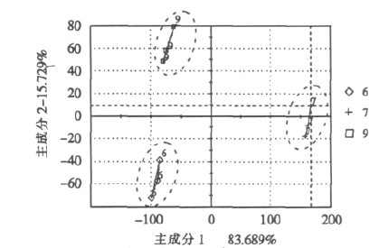 圖2 保寧醋樣品的主成分分析圖。6號為保寧醋特級;7號為保寧醋一級;8號為保寧醋二級