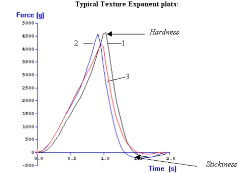 本實(shí)驗(yàn)采用保圣TA.XTC質(zhì)構(gòu)儀,運(yùn)用35mm 的柱型探頭(P/35對(duì)面條的)硬度和粘度進(jìn)行測(cè)定。試驗(yàn)參數(shù)為:測(cè)前、測(cè)中、測(cè)后速度均為2.0 mm/s,使用5kg 力量感應(yīng)元。在實(shí)驗(yàn)開(kāi)始前,必須校準(zhǔn)零點(diǎn),將兩根面條并排放置在探頭下,開(kāi)始實(shí)驗(yàn)。一旦力量感應(yīng)元感應(yīng)到10g力,曲線開(kāi)始記錄下壓樣品的全過(guò)程。最大力表明了樣品的硬度,數(shù)值越大,硬度越大。在最大力的比較中,兩種面條區(qū)別不是很明顯。然而,很清楚的可以看出第三種面條粘性比前兩種低。在實(shí)驗(yàn)過(guò)程中應(yīng)注意,把樣品放置在平臺(tái)上時(shí),必須保證樣品表面的平整。如果樣品有彎曲,力量感應(yīng)元會(huì)早感應(yīng)到數(shù)據(jù)別開(kāi)始記錄,數(shù)據(jù)會(huì)有誤差,樣品應(yīng)該每次都放到同一位置。