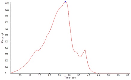 本試驗(yàn)采用球形探頭(TA/0.5S)及10kg的力量感應(yīng)元。采用單次測(cè)試模式(Basic Single Test),探頭的壓縮比35%,測(cè)前、測(cè)中、測(cè)后探頭的移動(dòng)速度分別為2 mm/s、1 mm/s、10 mm/s,圖像攫取速率為200 pps,試將樣品在實(shí)驗(yàn)前從包裝袋中取出,將4片樣品疊放子在探頭的中心下,開(kāi)始實(shí)驗(yàn)。由圖2可以看出,峰力表明了球形探頭下壓樣品的最大力,可用來(lái)表達(dá)樣品的堅(jiān)實(shí)度。其油炸薯片的堅(jiān)實(shí)度為1051.8±60.8 gf。