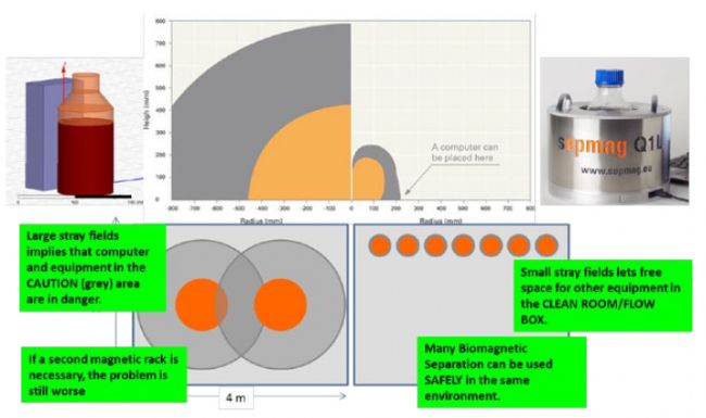 | 建議:首先,應(yīng)制定安全操作規(guī)范和計(jì)算安全操作范圍:設(shè)置警戒區(qū)域和危險(xiǎn)區(qū)域。其次,除了考慮磁分離器的分離性能外,還應(yīng)注意磁分離器/架產(chǎn)生的雜散磁場(chǎng)。盡可能選擇雜散磁場(chǎng)小的生物磁分離系統(tǒng)或安全的磁性分離設(shè)備。例如SEPMAG®先進(jìn)的磁性分離系統(tǒng)通過特殊的設(shè)計(jì)可以放置在電腦旁使用并且保護(hù)操作者遠(yuǎn)離使用傳統(tǒng)大型磁鐵可能帶來的危險(xiǎn)。這樣可以減少事故風(fēng)險(xiǎn),同時(shí)減少危險(xiǎn)區(qū)域,也為其他設(shè)備留出更多放置空間。 |
