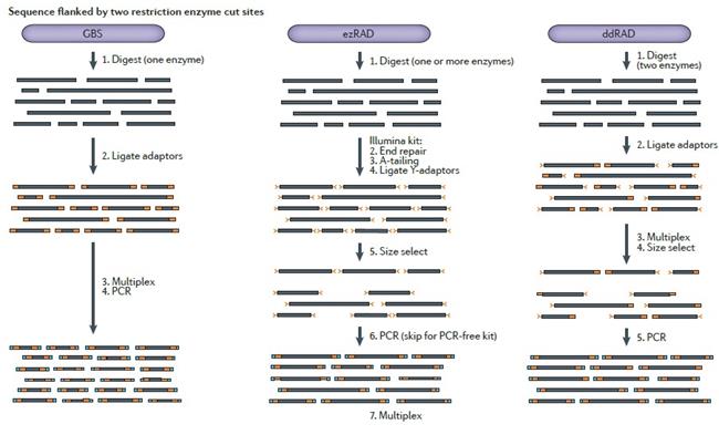 2) ezRAD:一個(gè)或多個(gè)常見(jiàn)酶酶切+illuminate建庫(kù)Kit建庫(kù)測(cè)序;