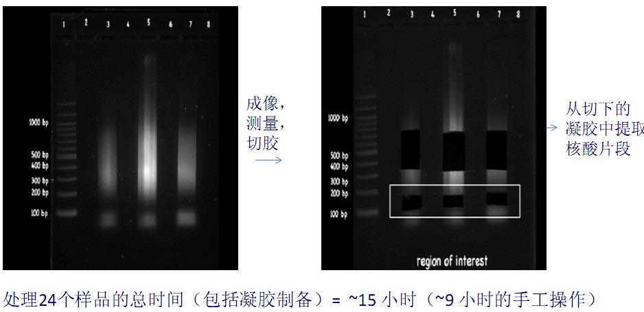手工切膠是根據(jù)最左邊的marker對(duì)照切割,即使是同一個(gè)人操作,也很難保證每個(gè)泳道,每個(gè)樣品目的范圍的一致性。