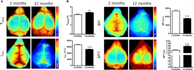 首先,研究人員使用吲哚氰綠(ICG)熒光示蹤劑尾靜脈給予小鼠注射后,利用實時成像模式,曝光時間160ms,間隔2min,一共拍攝50張實時圖像,通過選取右側(cè)半腦同區(qū)域動力學(xué)的常規(guī)指標(biāo)Trising、Imax、BFI、MTT的檢測,發(fā)現(xiàn)不同月齡的小鼠頭部的血流強度確實存在差異(圖一),表明年輕小鼠靜脈血流較快,同時腦部血容量也更大。