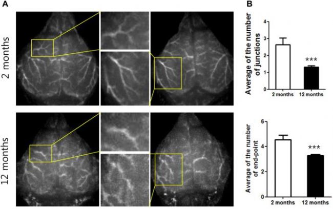 韓國慶熙大學(xué)的Hye-Min Kang等研究人員利用VISQUE活體成像技術(shù),研究了不同年齡階段小鼠腦部動脈血管結(jié)構(gòu)及血流的變化。