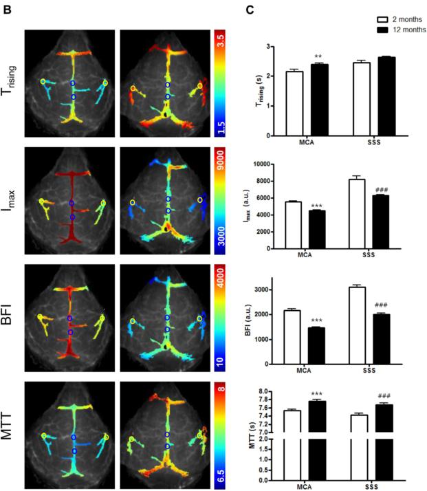 圖三:2月齡小鼠和12月齡小鼠大腦中動脈(MCA)和上矢狀竇(SSS)動力學(xué)比較
