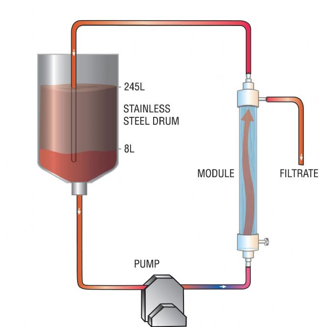 裂解液體積為245升。使用一根0.2 μm 的Krosflo® 組件進(jìn)行批量分離,膜表面積為1.0m2 。流路見圖1所示,料液的循環(huán)速率保持57L/min。先開始料液循環(huán),然后緩慢打開濾液端口。不限制下游循環(huán)。起始處理溫度為4°C,并緩慢升至12°C直到運(yùn)行結(jié)束。起始進(jìn)樣壓力為12psig,因?yàn)樯郎兀弦赫扯认陆,壓力下降?1 psig,而后又因?yàn)檫\(yùn)行結(jié)束前固體顆粒濃度增加而上升至13 psig。