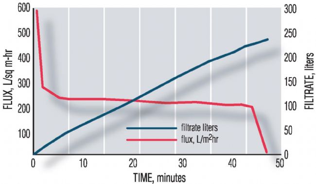 圖2. 大腸桿菌裂解液過濾通量和濾液總體積 vs. 時(shí)間