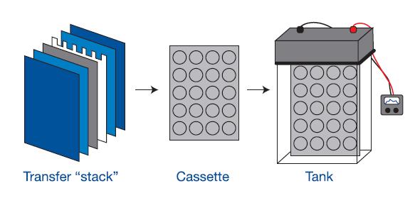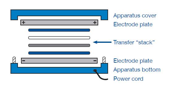對于半干轉(zhuǎn)來說,也需要進行堆疊組裝(濾紙,膠,膜需要放在轉(zhuǎn)印buffer中進行預平衡)放在裝置電極板的底部,蓋上上極板,高強的電流通過三明治結(jié)構(gòu),轉(zhuǎn)印速度較快,一般小于1h。