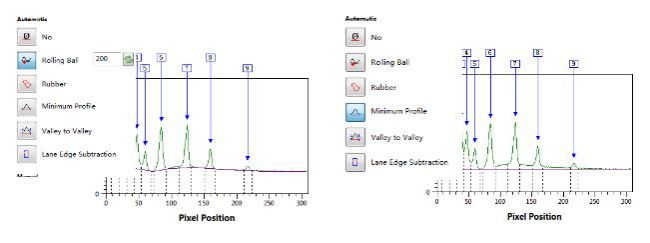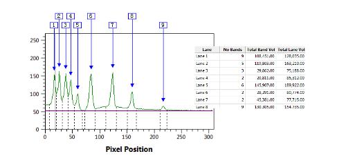 1.在樣品上進行泳道劃分 2.設(shè)置閾值,檢測條帶