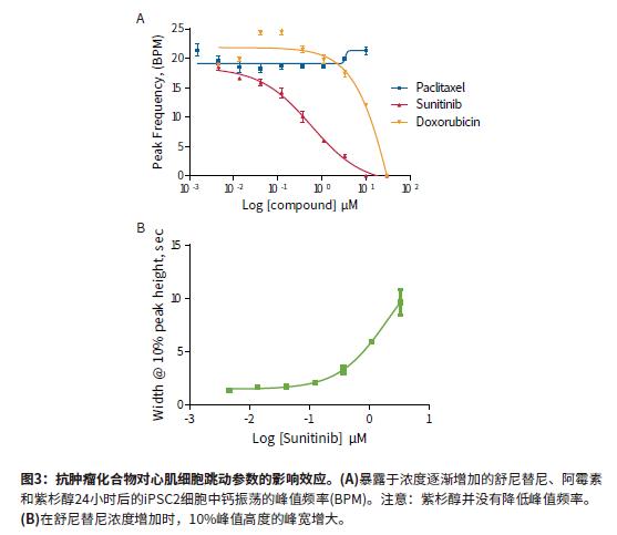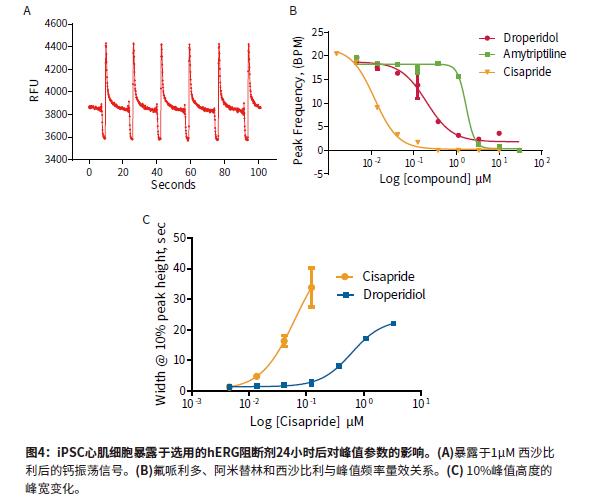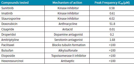 用FLIPR Tetra系統(tǒng)在化合物添加24小時(shí)后進(jìn)行鈣振蕩信號的檢測和記錄。iPSC2s與之前版本的iPSCs以相同的方式進(jìn)行實(shí)驗(yàn),通過形成縫隙連接并同步振蕩,檢測到鈣敏感染料指示的峰值頻率。新型細(xì)胞比之前版本的細(xì)胞可提早4-5天用于檢測實(shí)驗(yàn),同時(shí)因其更低的污染風(fēng)險(xiǎn)和一個(gè)整體較短的時(shí)間周期并得到類似的結(jié)果,明顯改善了篩選的工作流程。用于實(shí)驗(yàn)研究的抗腫瘤化合物包括:舒尼替尼、伊馬替尼和星形孢菌素(由于毒性原因而不作臨床使用的化合物)均是激酶抑制劑;白消安,一個(gè)烷基磺酸鹽;阿霉素,一種蒽環(huán)類藥物;依托泊苷,一種拓?fù)洚悩?gòu)酶II抑制劑;而紫杉醇會干擾細(xì)胞管蛋白的生成。在化合物添加24小時(shí)后,一些鈣振蕩信號變化明顯異于對照組(圖2)。舒尼替尼的振蕩頻率較低,且在10%峰值高度的峰寬顯著大于對照組。其它具有相似鈣振蕩結(jié)果的抗癌化合物包括伊馬替尼(Imatinib)和星形孢菌素(Staurosporine)。這三種化合物與阻斷hERG通道有關(guān)。hERG基因編碼了鉀通道,有助于心臟跳動的恢復(fù),其被阻斷有可能引起長QT綜合征或尖端扭轉(zhuǎn)型室性心律失常。紫杉醇、白消安和依托泊苷未知有hERG活性,且沒有類似的鈣振蕩減慢效應(yīng),也沒有10%峰值高度的峰寬增大的效應(yīng)。量效曲線顯示,24小時(shí)暴露于阿霉素和舒尼替尼后峰值頻率顯著降低。紫杉醇也是一種不影響峰值頻率的化合物(圖3)。除抗癌化合物外,已知的hERG阻斷劑氟哌利多,一種抗精神病藥物和多巴胺受體阻斷劑;阿米替林,三環(huán)抗抑郁藥和5-羥色胺受體抑制劑;以及西沙必利,一種抗酸劑,均是已知的可導(dǎo)致長QT綜合征。此三種化合物也都在實(shí)驗(yàn)中進(jìn)行了檢測。在24小時(shí)內(nèi)加入iPSC2s時(shí),這三種化合物的峰值頻率都在降低以及10%峰值高度的峰寬增大(圖4)。在鈣振蕩測定中所測試的所有化合物的IC50值的總結(jié)如表2所示。