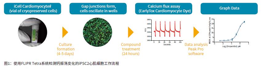 干細(xì)胞公司CDI (Cellular DynamicsInternational) 已經(jīng)開發(fā)了一種增強(qiáng)版的iPSCs分化的心肌細(xì)胞,其復(fù)蘇后恢復(fù)的速度比之前版本的iPSCs更快。這樣的改進(jìn)使得在FLIPR Tetra 高通量實(shí)時(shí)熒光檢測分析系統(tǒng)上檢測化合物對跳動的心肌細(xì)胞鈣瞬變信號影響的工作流程縮短生長時(shí)間5 - 7天。圖1是示例的工作流程。本文中我們闡述了一些癌癥化合物的檢測,其中一些已知會影響hERG通道,其它化合物已知可以阻斷hERG通道。