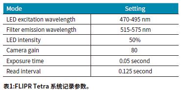 實(shí)驗(yàn)前24小時(shí),以終濃度30μM開始的對數(shù)稀釋的各種化合物加入到iPSC 心肌細(xì)胞中。檢測之前兩個(gè)小時(shí)25μL體積的溶于維持培養(yǎng)基的2倍濃度的EarlyTox心肌細(xì)胞毒性檢測染料添加到每孔中,并在37°C、5% CO2條件下孵育。當(dāng)細(xì)胞從培養(yǎng)箱取出后,鈣離子濃度的變化會隨著細(xì)胞的振蕩而變化,從而引起FLIPR Tetra系統(tǒng)所記錄的熒光信號的改變。在ScreenWorks工作軟件中的實(shí)驗(yàn)方案和參數(shù)設(shè)置如表1所示。數(shù)據(jù)分析使用了ScreenWorks PeakPro軟件模塊,并在GraphPad Prism 6中繪制了圖形。