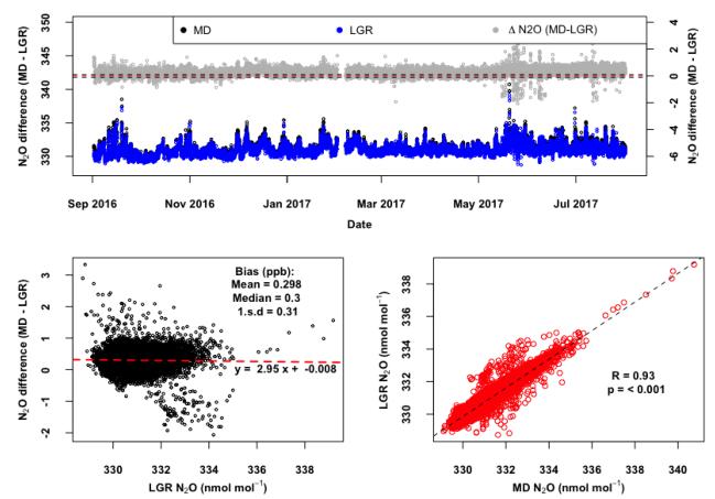 圖4. 2016年9月1日至2017年8月1日期間的N2O兼容性結(jié)果:a)LGR和GC-ECD N2O值的時間序列,b)儀器之間的N2O差異,以及c)儀器報告值之間的相關(guān)性。