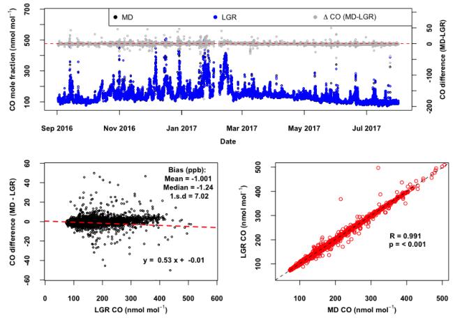 圖5. 2016年9月1日至2017年8月1日期間的CO兼容性結(jié)果:a)LGR和GC-ECD CO值的時間序列,b)儀器之間的CO差異,以及c)儀器報告值之間的相關(guān)性。