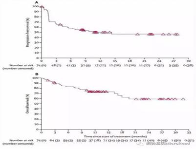 截止2017年1月時(shí),仍有36名(49%)患者仍在接受治療。23名患者獲得了客觀緩解,51名患者在接受納武單抗治療12周時(shí)疾病得到了控制。