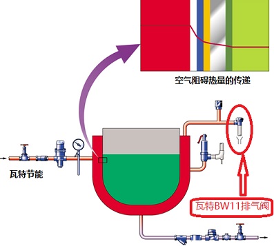 蒸汽系統(tǒng)中存在空氣會產(chǎn)生一定的危害,空氣是熱的不良導(dǎo)體,事實(shí)上空氣的熱阻是鐵和鋼的1500倍以上,更是銅的熱阻的13000倍。