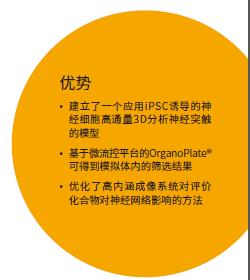 建立生理學上模擬體內(nèi)環(huán)境的體外模型對了解神經(jīng)系統(tǒng)疾病機制和藥物研發(fā)具有至關(guān)重要的作用。干細胞誘導的神經(jīng)細胞培養(yǎng)在3D環(huán)境下,對于化合物篩選和疾病模型建立有較大的潛力。3D培養(yǎng)被認為是最接近人體組織的體外培養(yǎng)方法,無論是結(jié)構(gòu)、細胞生長特點及細胞與細胞和細胞與基質(zhì)之間的相互作用,都很好的模擬了體內(nèi)環(huán)境。本篇說明介紹了一個新的神經(jīng)退行性疾病和神經(jīng)毒性篩選的方法,應用iPSC誘導的神經(jīng)細胞在OrganoPlate®高通量微流控平臺上進行3D水平上的神經(jīng)突觸檢OrganoPlate®是一個結(jié)合了最新3D培養(yǎng)技術(shù)和微流控技術(shù)的高通量篩選平臺,基于96孔組織芯片,可以做長時間活細胞檢測,滿足篩選需要,并且兼容常用實驗室設備和自動化系統(tǒng),如ImageXpress® MicroConfocal高內(nèi)涵成像和分析系統(tǒng)。