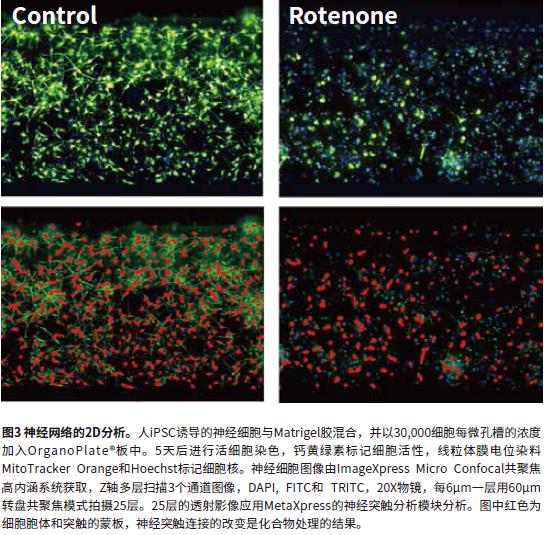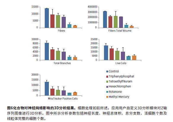 應用MetaXpress®高內(nèi)涵圖像采集和分析軟件進行圖像分析。全自動的對圖像進行定量分析使用的兩種方法:做透射后進行2D分析和Z-stack的3D水平分析。對2D透射圖像分析, Z - s t a c k 序列圖像進行Maximum透射,然后用軟件預置的神經(jīng)突觸分析模塊進行分析。輸出的評價不同時間點細胞表型及神經(jīng)網(wǎng)絡復雜程度的參數(shù)包括:突觸總長度、突觸個數(shù)、細胞數(shù)和細胞活力。透射光的圖像用Best Focus算法進行2D透射后進行分析。2D圖像的分析速度快,可精確的評價神經(jīng)網(wǎng)絡的程度。但是,2D分析有一定的局限性,這種方法無法計算如體積這樣的參數(shù),并且得到的只是單層的結(jié)果。圖2和3所示為熒光合成圖,對照組和魚藤酮處理組圖片被神經(jīng)突觸模塊分析后的mask圖片。分析參數(shù)包括:突觸總長度、突觸個數(shù)和細胞總個數(shù)(細胞體)。圖4顯示了神經(jīng)突觸長度、突觸個數(shù)和細胞活力的隨化合物的處理而減少,神經(jīng)毒性化合物包括:磷酸三苯酯、四乙基秋蘭姆、六氯酚、魚藤酮和甲基汞(均為10μM)。
