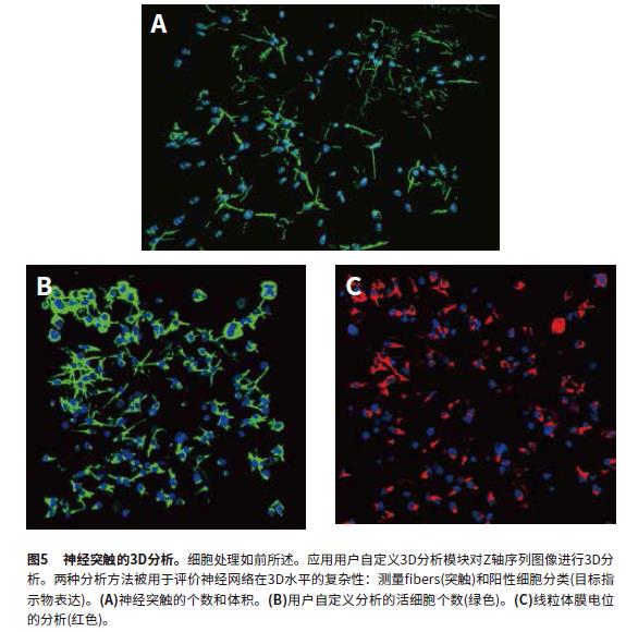 MetaXpress軟件可以將Z軸序列圖像重構(gòu)成3維立體結(jié)構(gòu)觀察細胞核及細胞網(wǎng)絡,并進行3D水平的分析。圖像應用用戶自定義的3D分析中“findfibers”功能,“fibers”數(shù)值評價神經(jīng)突觸;同時計算了細胞個數(shù)。計算對象首先在每層中識別出,然后使用“connect bybest match”功能將其在3D空間中連接起來。3D分析使突觸計算更準確,是一個評估神經(jīng)連接等更好的方法。3D分析得到的參數(shù)包括突觸個數(shù)、細胞體積、總突觸體積、分支個數(shù)和節(jié)點數(shù)。細胞總個數(shù)是通過在Hoechst染色通道識別“sphericalb j e c t s ” 。圖5 所示為分析識別“fibers”和“nuclei”的蒙板。另一個用戶自定義模塊分析細胞活力特征(鈣黃綠素陽性的胞體)和線粒體完整性(MitoTracker Orange陽性的胞體)。細胞分類分析可以得到活細胞個數(shù)(鈣黃綠素陽性的胞體)和有完整線粒體的細胞個數(shù)(MitoTracker Orange陽性)。計算結(jié)果包括細胞個數(shù)(total nuclei),活細胞個數(shù)(Calcein AM positive),以及細胞體積和熒光強度。圖5B和5C所示為“Calcein AMpositive cytoplasm”,“MitoTracker positive cytoplasm” 和 “nuclei”的識別蒙板。圖6顯示了化合物影響神經(jīng)網(wǎng)絡的幾個特征參數(shù): 突觸個數(shù)的減少(fibers),節(jié)點個數(shù),以及活細胞個數(shù)和完