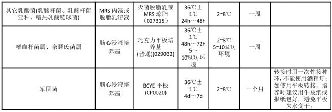 注:培養(yǎng)基后面的數(shù)字編號為廣東環(huán)凱微生物有限公司的產(chǎn)品編號,如需采購,請聯(lián)系經(jīng)銷商或業(yè)務(wù)員。上表提供了菌種傳代短期保存的方法,供參考。