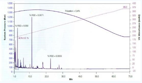 如果談到藥材-飲片-“標(biāo)準(zhǔn)煎液”指紋圖譜/特征圖譜的質(zhì)量相關(guān)性,檢測靈敏度和色譜保留的重現(xiàn)性尤為重要!Vanquish UHPLC系統(tǒng)采用低色散的LightPipeTMDAD流通池,可以在相同時間內(nèi)獲得更高的色譜峰容量和更精細(xì)的指紋圖譜;專利的進(jìn)樣預(yù)壓縮技術(shù)能有效消除進(jìn)樣時的壓降,保持高壓(1350Bar)條件下依然極佳的保留時間重現(xiàn)性(n=7,圖3),以上將為質(zhì)量關(guān)聯(lián)性研究及多批次“標(biāo)準(zhǔn)煎液”指紋圖譜的相似度比較提供最可靠的數(shù)據(jù)!