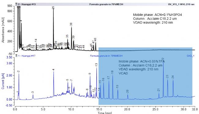 我們常用HPLC-UV/DAD檢測指紋圖譜的技術(shù)真的可以反映“整體質(zhì)量概貌”嗎?經(jīng)典名方里都是復(fù)方制劑,涵蓋的化合物性質(zhì)千差萬別,是不是非紫外吸收的成分就被遺漏了?舉個黃芪指紋圖譜的例子(圖1)),我們發(fā)現(xiàn)采用賽默飛獨(dú)有的CAD荷電氣溶膠檢測器竟然比DAD多檢測出至少10個非紫外吸收的成分,有沒有覺得CAD指紋圖譜的補(bǔ)充離“整體質(zhì)量概貌”更近一步?ELSD也是現(xiàn)行被廣泛采用的檢測器,但我們發(fā)現(xiàn)對于同濃度竹節(jié)參的指紋圖譜分析中(圖2),CAD獲得比ELSD更高的檢測靈敏度!指紋圖譜的研究怎可少了CAD檢測的出色結(jié)果呢?