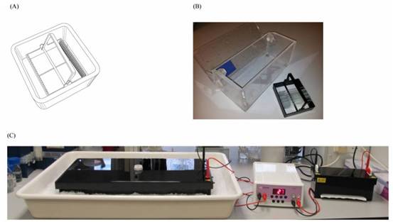 Figure 2 (A)可以容納25個載玻片的高通量載玻架圖例。染色盒可以用來完成裂解、中和、染色以及所有與清洗有關(guān)的步驟。(B)高通量電泳槽-1和高通量載玻架。高通量電泳槽-1最初是用來演示實驗原理。(C)傳統(tǒng)彗星實驗裝置(左)和新型高通量電泳槽-2(右)的差別圖,圖中兩個裝置共用了一臺電源。