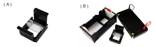 在后來的產(chǎn)品開發(fā)中,Cleaver Scientific公司又進(jìn)一步改進(jìn)實驗裝置,設(shè)計了懸浮的載玻架(Figure 3A),并在整套高通量彗星電泳實驗裝置中配備了染色托盤,用來批量處理載玻片,同時還開發(fā)了陶瓷冷卻底座(Figure 3B)和冷卻包,保證最佳的電泳緩沖液溫度,提高電泳效率。