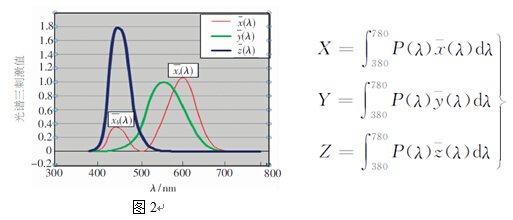 光源的色度用色品坐標(biāo)x,y表示,與光源的相對(duì)光譜功率分布有關(guān)。如果一個(gè)光源的相對(duì)功率分布函數(shù)用P(λ)來(lái)表示,`x(λ)、`y(λ)、`z(λ)代表CIE1931標(biāo)準(zhǔn)光譜三刺激值,如圖2所示,則此光源的三刺激值可用如下公式來(lái)表示: