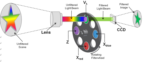 成像式亮度色度計(jì)是一種基于成像原理來(lái)進(jìn)行測(cè)光和測(cè)色的計(jì)量?jī)x器,基本結(jié)構(gòu)是由視覺(jué)(或色覺(jué))匹配的探測(cè)器、光學(xué)系統(tǒng)以及亮度色度(利用三色濾鏡,WP的成像亮度色度計(jì)采用的是四片濾光片)等參數(shù)的信號(hào)輸出處理系統(tǒng)所組成。