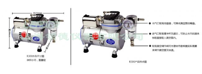 1.機身小巧、重量輕:由于無油真空泵不需要其他介質參與工作,所以省去了儲油艙、水箱等額外儲藏工作介質的部件(傳統(tǒng)水循環(huán)泵和油泵尺寸較大并非因為他們功率大、抽吸效果更好,而在于機器本身帶有水箱和儲油艙),它的外形尺寸可以變得更為小巧,例如R300無油真空泵的外形尺寸為272×121×164cm,而一張A4紙的尺寸為210mm×297mm,所以R300任何一個表面的面積均小于一張A4紙。小巧的體積也是的整機重量僅為4.1KG,更加輕便。小巧的體積和極輕的整機重量使得無油真空泵占用更少的臺面空間,適合作為大型設備的配套氣源;便于移動,甚至是攜帶外出使用。