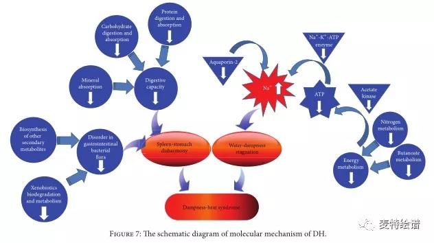 中醫(yī)理論,博大精深,蘊含著豐富的理論指導(dǎo)。例如,“同病異證”“異病同證”理論,可以首先通過“同病異證”祛除所研究證候以外的證候信息,再通過“異病同證”篩選不同疾病中同一證候的差異物交集來尋找不同疾病中相同證候的共性物質(zhì)基礎(chǔ)。例如,基于“同病異證”理論,對慢性乙型肝炎患者中實證和虛證患者尿液代謝物進行非靶向檢測,通過統(tǒng)計分析共篩選39個差異代謝物,進行ROC分析,發(fā)現(xiàn)吡喃木糖苷、核糖酸、尿酸、d-核糖、環(huán)己酮五種物質(zhì)的ROC面積達到0.7-0.92;“異病同證”理論,對慢乙肝和脂肪肝中的濕熱證與非濕熱進行“異病同證”研究,發(fā)現(xiàn)濕熱證患者中能量代謝、氨基酸代謝、脂質(zhì)代謝等通路發(fā)生異常。最終通過生物信息學(xué)分析,初步探討了濕熱證的生物學(xué)內(nèi)涵,如圖3。