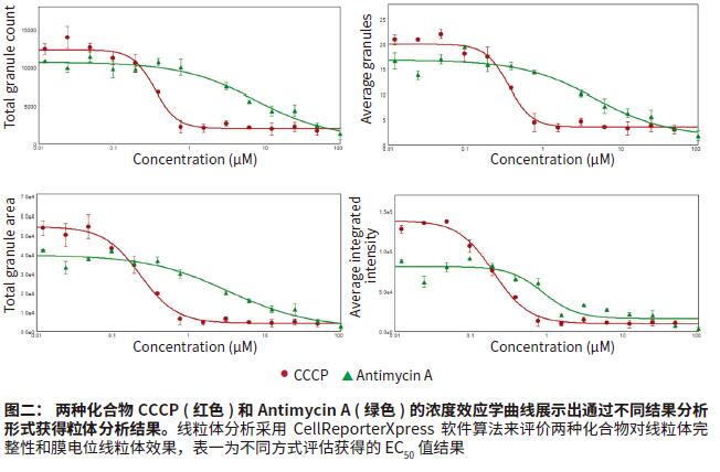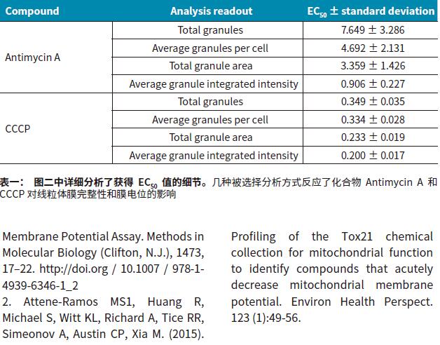 如下圖一所示,質(zhì)控組細胞和氧化磷酸化抑制劑 CCCP 處理后的細胞,可以觀察到期線粒體完整性 ( 桔色 ) 有著顯著的差異,我們利用 CellReporterXpress 軟件預(yù)置的線粒體分析模板來評價其線粒體損傷。細胞核染色后確定單個細胞,分析發(fā)現(xiàn)每個細胞內(nèi)顆粒 ( 線粒體 ),可以采用多個參數(shù)進行結(jié)果分析,例如顆粒總數(shù)、顆粒面積、每個細胞內(nèi)的顆粒數(shù)目、平均熒光強度和顆粒的整體熒光信號強度。結(jié)果以濃度效應(yīng)學曲線展示出其 EC50 值,如圖二和表一所示。