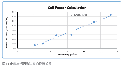 測(cè)定細(xì)胞系數(shù) 在做在線測(cè)量之前,我們首先需要確定細(xì)胞系數(shù),即細(xì)胞密度與介電常數(shù)之間的換算關(guān)系。 圖1顯示了細(xì)胞密度與介電常數(shù)之間的線性關(guān)系。通過(guò)這種線性換算,我們可以很方便的將直接測(cè)量獲得的介電常數(shù)換算成其他的單位(例如個(gè)數(shù)/L等)。 |