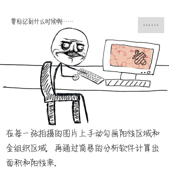 據(jù)其介紹,以量最大的肝臟組織天狼腥紅染色業(yè)務為例,大致的工作經(jīng)過的畫風是這樣的: