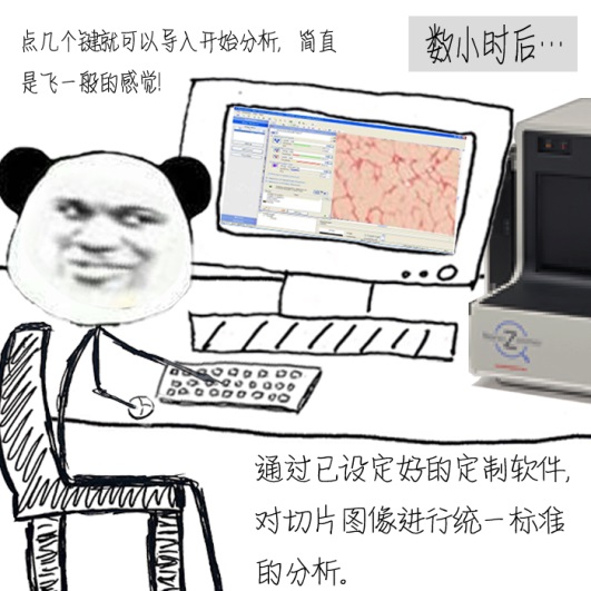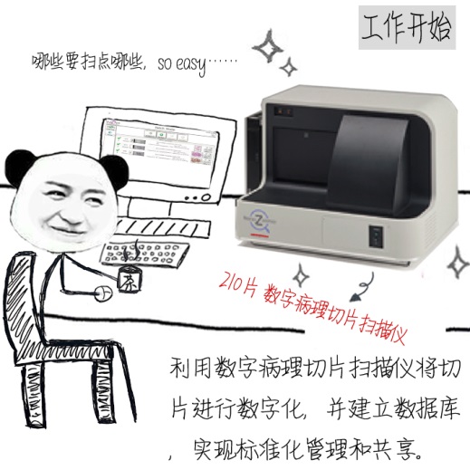 一改以往完全依賴人工的狀況,有了數(shù)字病理分析平臺后,工作的經(jīng)過和畫風變成了這樣: